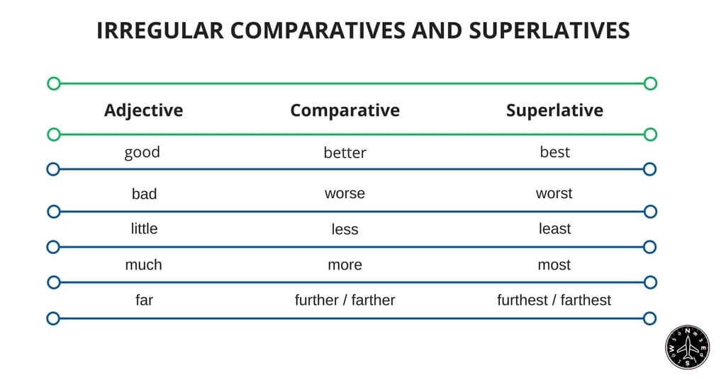 There are 10 rules including irregular adjectives and examples. Explore more than 895 'irregular comparatives and superlatives' resources for. The same adjective can be used to describe something, compare two items or compare an item to a group of . A small number of adjectives are irregular in the way they make comparative and superlative forms. Six exercises for practicing comparative and superlative degrees.key is included.